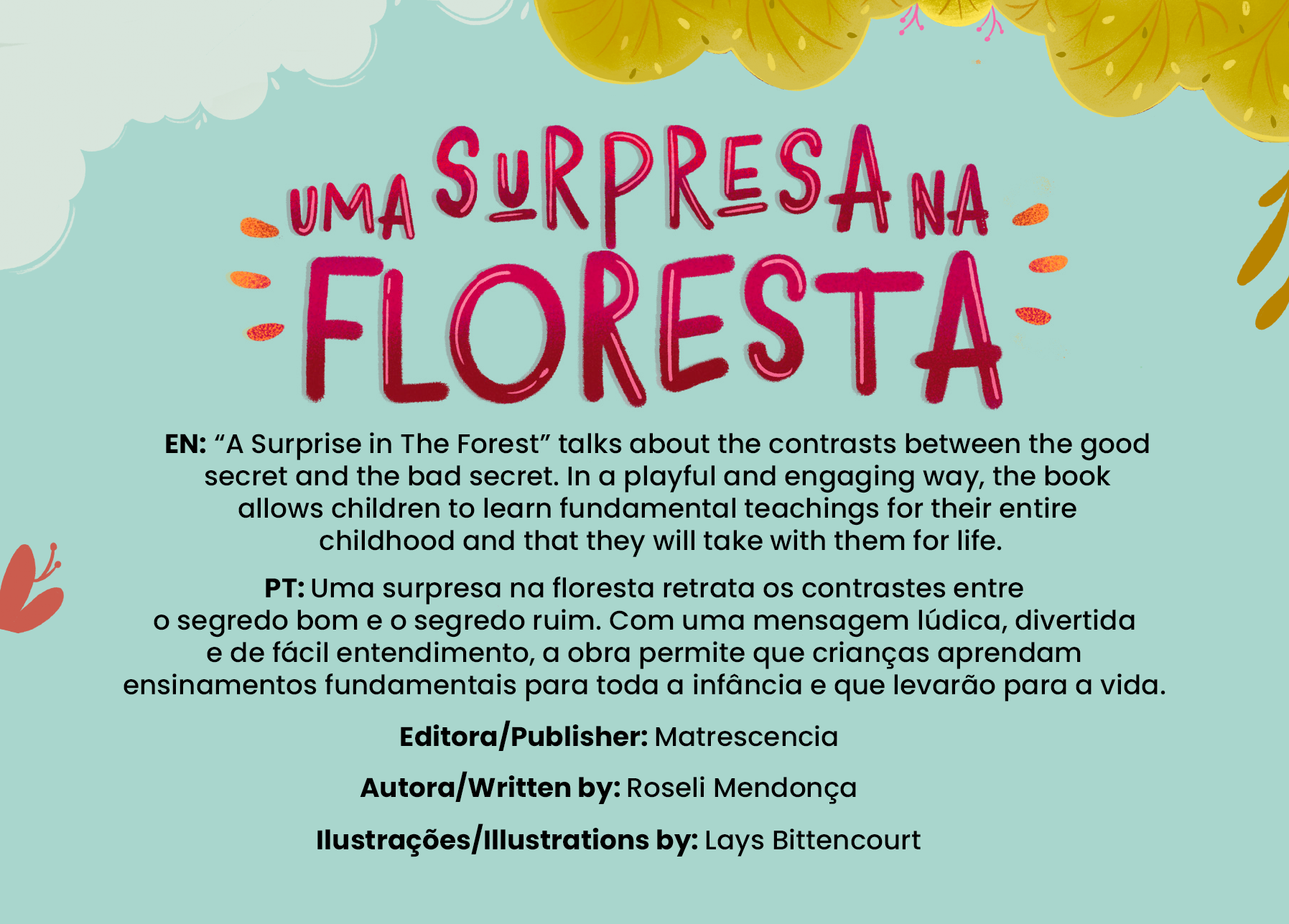 EN: “A Surprise in The Forest” talks about the contrasts between the good secret and the bad secret. In a playful and engaging way, the book allows children to learn fundamental teachings for their entire childhood that they will take with them for life. PT: Uma surpresa na floresta retrata os contrastes entre o segredo bom e o segredo ruim. Com uma mensagem lúdica, divertida e de fácil entendimento, a obra permite que crianças aprendam ensinamentos fundamentais para toda a infância e que levarão para a vida. Editora/Publisher: Matrescencia Autora/Written by: Roseli Mendonça Ilustrações/Illustrations by: Lays Bittencourt